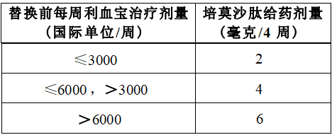 目前正在接受利血宝治疗的慢性肾脏病(CKD)透析患者可以换用本品治疗。本品的初始剂量应根据患者换药前每周利血宝的用药剂量按表1进行换算。替换过程中,患者在接受最后一次促红细胞生成素给药后,需间隔一周才能接受首次培莫沙肽给药。